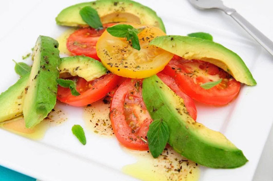 نضع البصل الأخضر على الخس ثم نضيف البندورة وقطع الأفوكادو