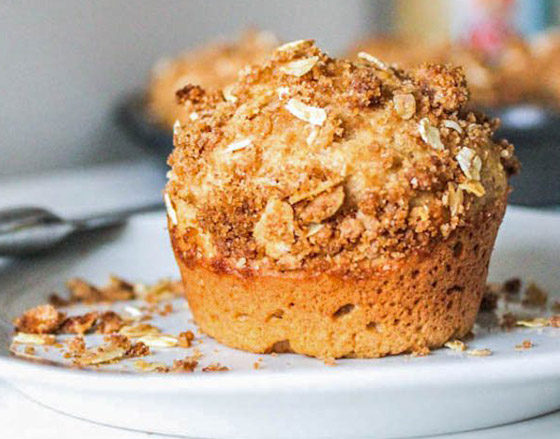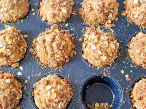 3. الخطوة الثالثة: في وعاء صغير، اخلط ملعقتين كبيرتين من الدقيق، وربع كوب سكر، ونصف ملعقة صغيرة من القرفة، ضع الزبدة حتى يصبح الخليط مثل الفتات الخشن، يرش الخليط بالتساوي فوق خليط المافن.