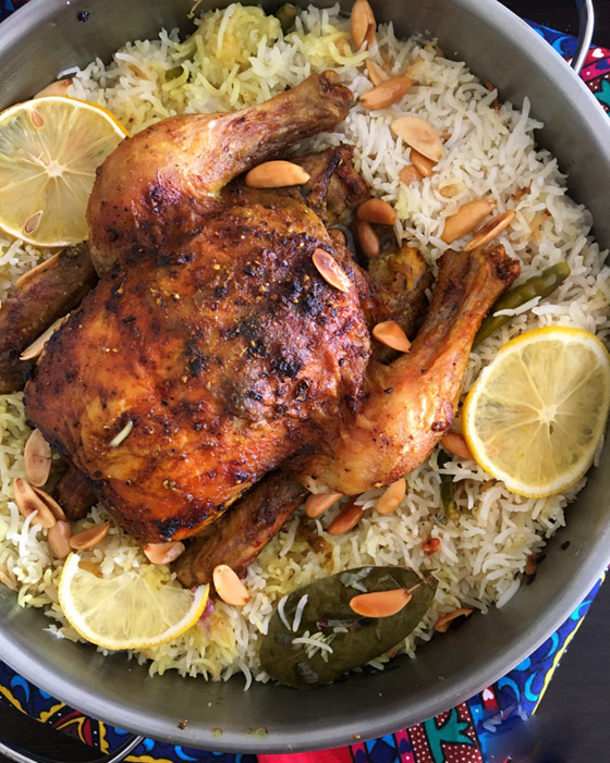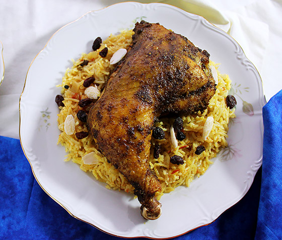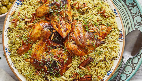 20. في طبق التقديم، ضعي قطع الدجاج فوق الأرز وزيّني بالمكسرات وقدّميه إلى جانب صلصة الدقوس الحارة.