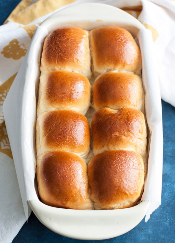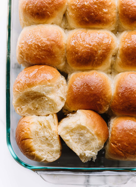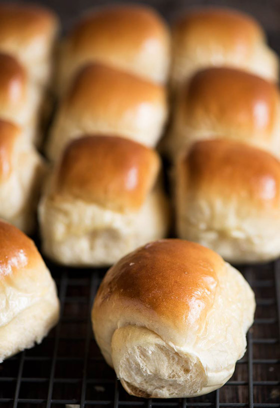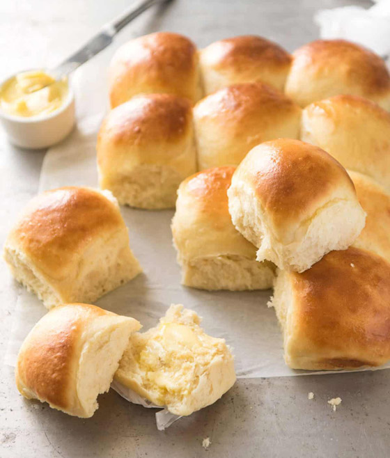 8. وزعوا الزبدة بواسطة فرشاه فوق كرات العجين وأدخلوها الفرن لمدة 20 - 25 دقيقة حتى تنضج وتتحمر.