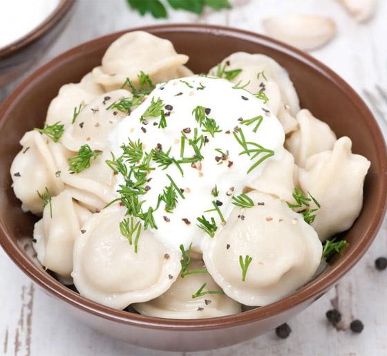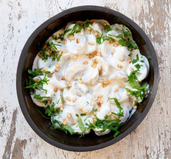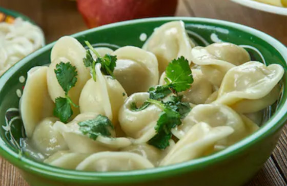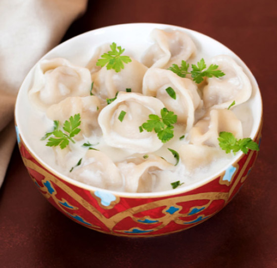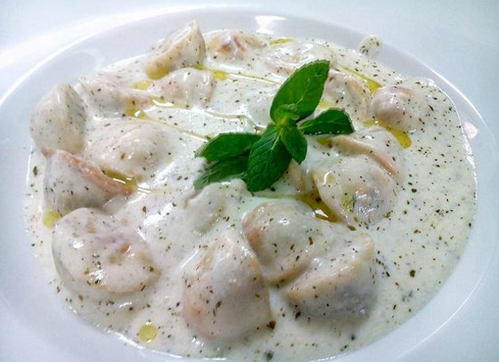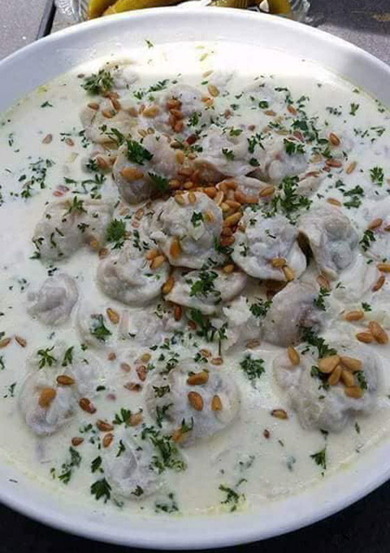 3. للحشو: يُقسّم لحمة الكفتة إلى خمسين دائرة متساوية؛ يوضع كل كرة من الكفتة على دائرة العجين، التي تُطوى العجينة، وتُطبّق أطرافها باليد، وتُلفّ على بعضها البعض.