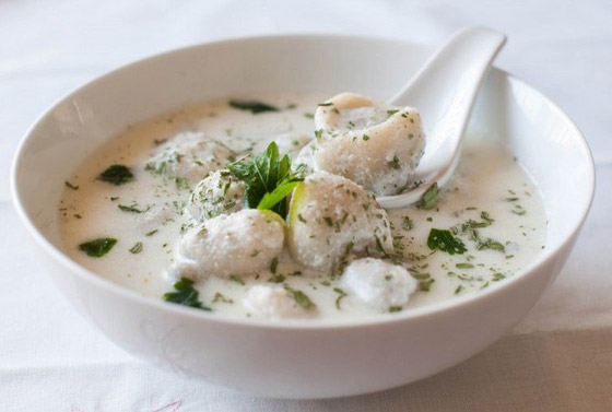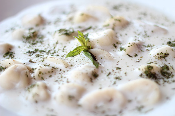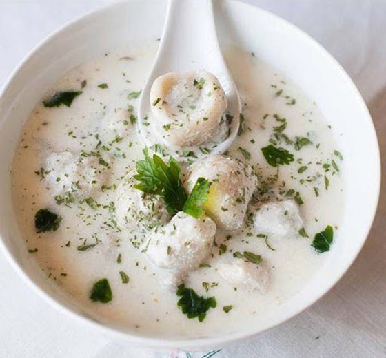 5. للبن: يُذاب النشاء بالماء (على البارد)، فيُضاف إلى وعاء، مع مقادير اللبن الأخرى (الزبادي والطحينة والكزبرة الطازجة مع الثوم، والفلفل والملح). يُخلط المزيج بشريط الخفق (على البارد). يوضع خليط اللبن على النار، ويُحرّك باستمرار حتى بدء الغليان. لكن، يجب تجنُّب غليان اللبن طويلًا.