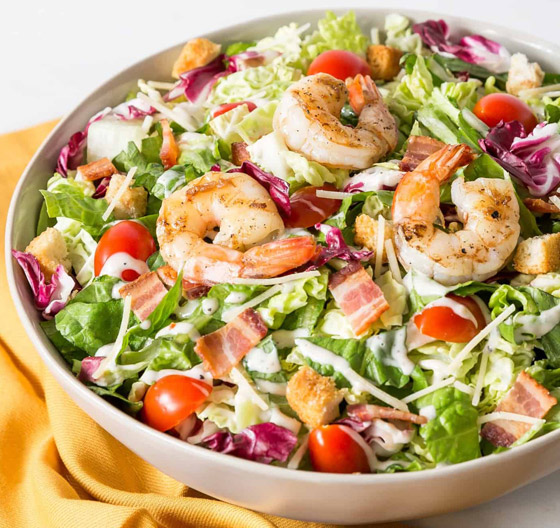 5. للتقديم: اسكبوا الصلصة فوق الخسّ والروبيان ثم أضيفوا الكروتون وقدّموها فوراً.