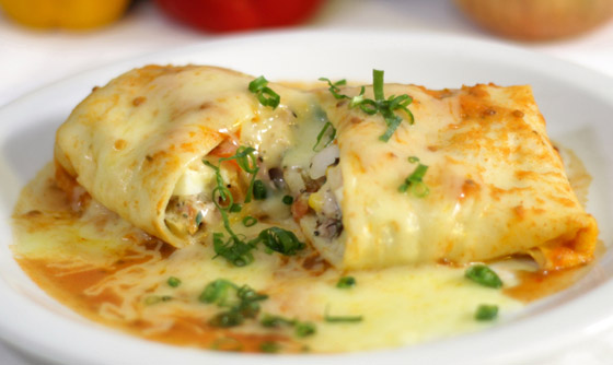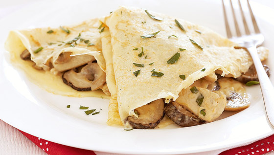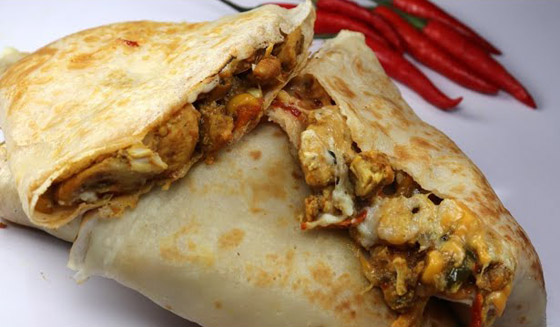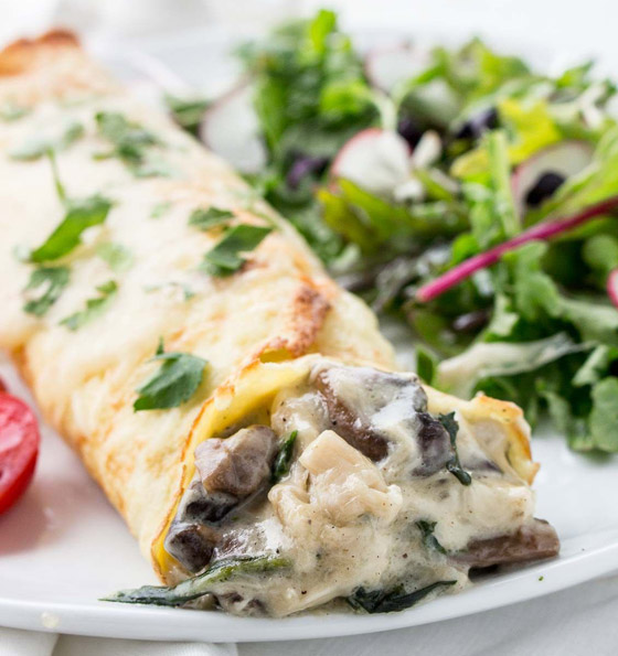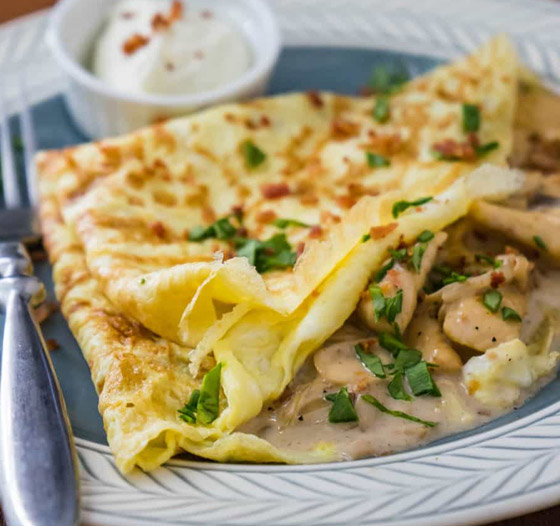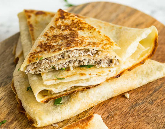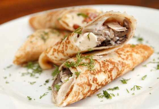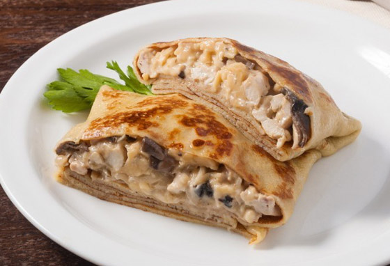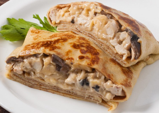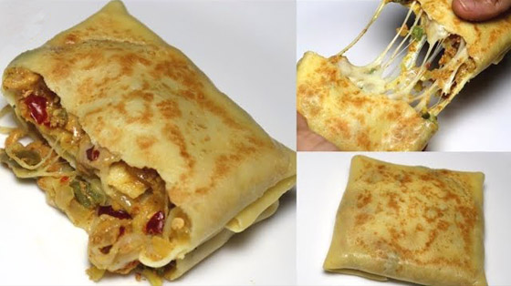 10. وزّعوا جبن الموزاريلا على الكريب، وأضيفوا مزيج الدجاج ولفّوا الكريب على شكل رول.