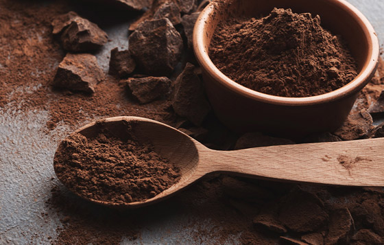 7- بودرة الكاكاو غير المحلاة: أو بكل بساطة، مسحوق الكاكاو، وهو الشكل الأساسي للشوكولاتة بعد طحن بذور ثمرة شجرة الكاكاو. يتم تخمير هذه البذور وتجفيفها ثم تحميصها، قبل إزالة قشر الحبوب المحمصة ومعالجتها لاستخراج زبدة الكاكاو من الحبوب، ولاحقاً تُطحن المواد الصلبة ليتم بيعها كمسحوق.