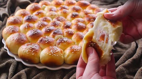 2 كوب دقيق ونص 3 معالق كبار حليب بودرة 3 معالق كبار سكر ملعقة كبير خميرة رشة ملح ربع كوب زيت كوب ماء دافئ جبنة موزاريلا بيضة حليب فانيليا.