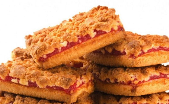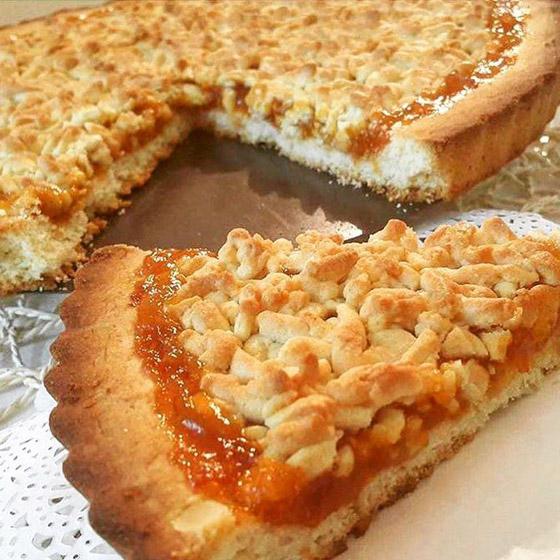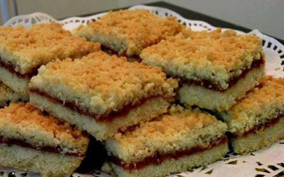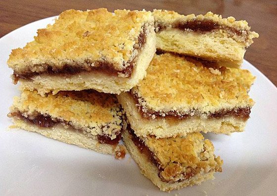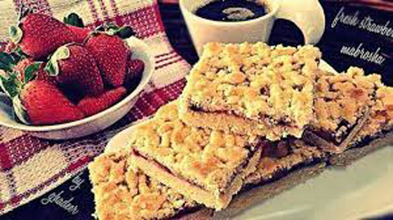 - تفرد نصف كمية العجين في صينية مستطيلة، وتدهن العجينة بالمربى.