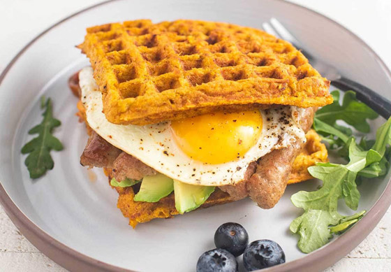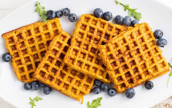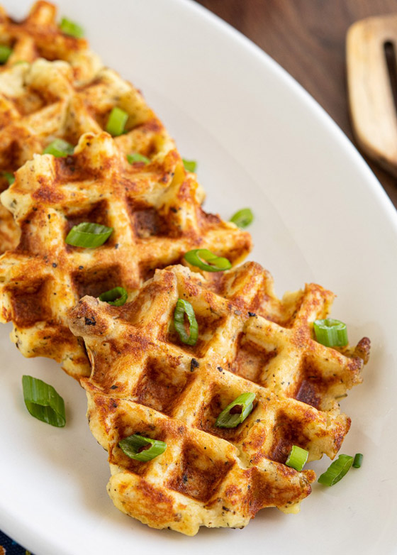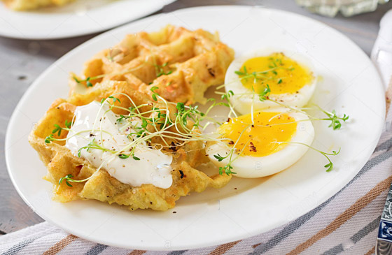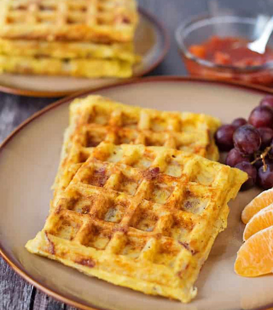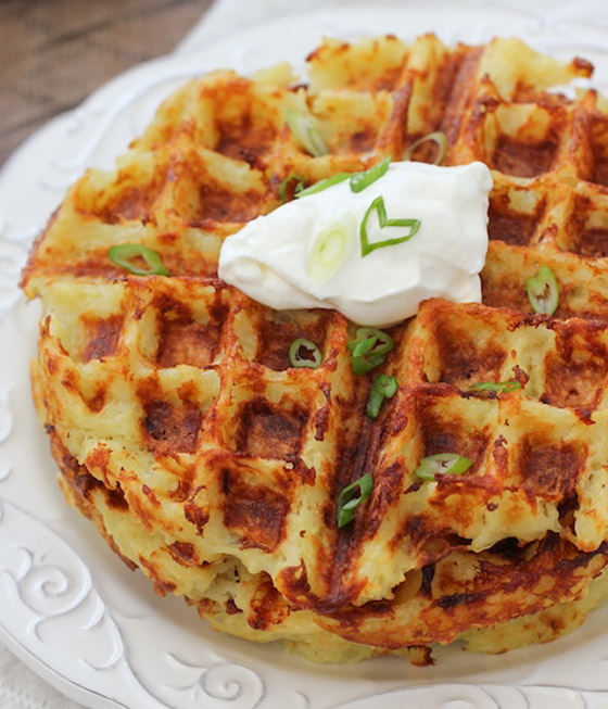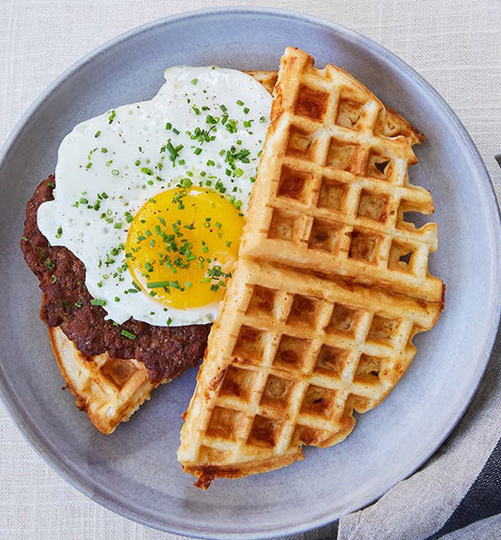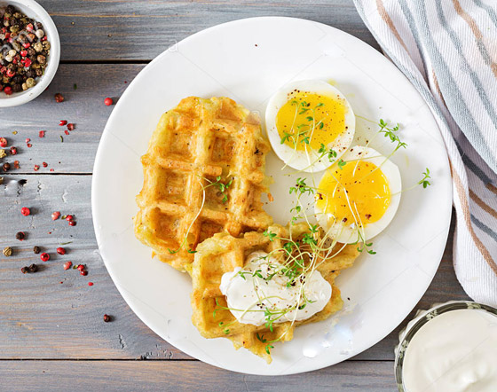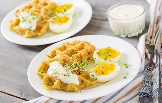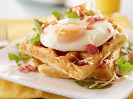 4. وزعوا المزيج في جهاز تحضير الوافل المحضر وحمروها لمدة 10 دقائق حتى تنضج ويذوب الجبن.