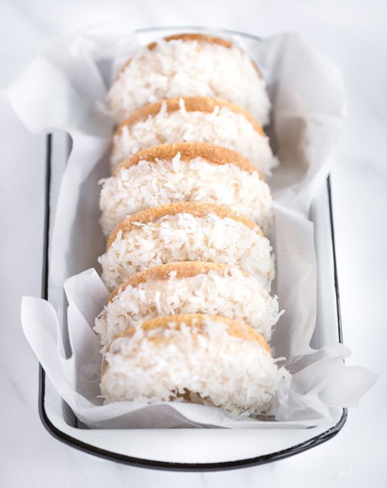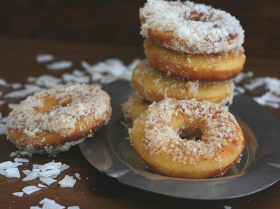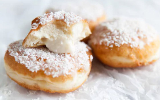 8. أزيلوا الدونات من المقلاة واغمسوها في جوز الهند المحضّر مسبقاً ليكون طبقة الحلوى ثم اتركوها لتبرد.
