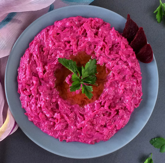 8. اخلطوا الشمندر المبشور مع صلصة الطحينة وزيت الزيتون والشبث والنعناع.
