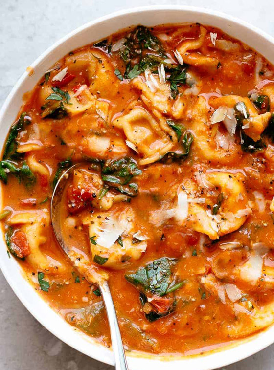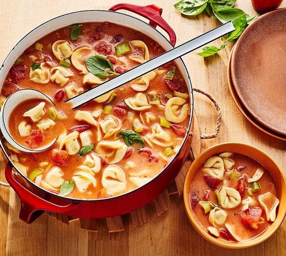 2. أضيفوا معجون البندورة واطهوه من دقيقتين إلى 3 دقائق حتّى يصبح داكناً قليلاً، ثمّ أضيفوا المرق والبندورة والتورتيليني، واغلوا المزيج حتى تنضج المعكرونة لمدّة 10 دقائق تقريباً.
