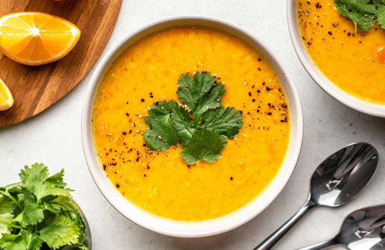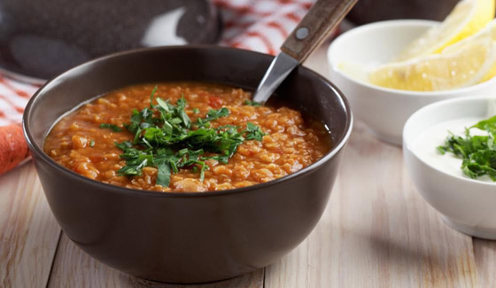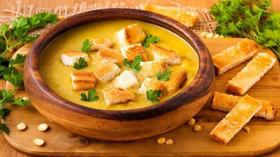 8. تقدّم شوربة العدس ساخنة مع تزيين الوجه بالخبز المحمص والبقدونس المفروم وعصير او شرحات الليمون إن أحببتم.