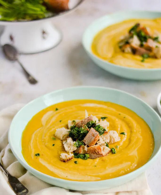 6. يهرس الحساء في الخلاط الكهربائي او باستعمال هاند بليندر حتى يصبح ناعما.