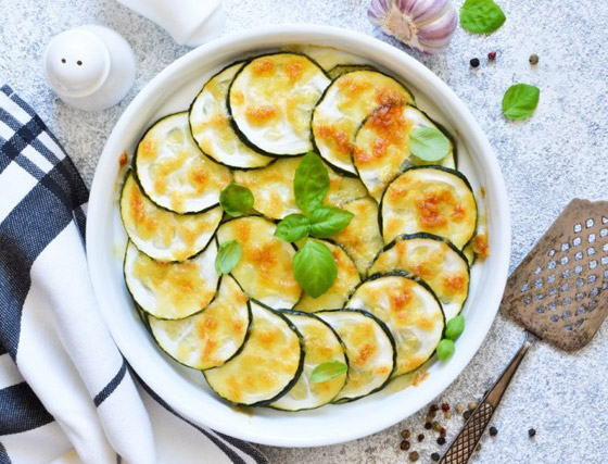 1. سخنوا الزيت في مقلاة واقلوا الكوسا الشرائح مع الفلفل والملح حتى تتحمر وتذبل ثم ضعوها في طبق.