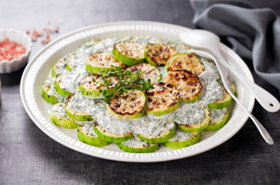 3. قوموا بتوزيع المزيج فوق الكوسا المقلية وقدموها دافئة أو باردة حسب الرغبة.