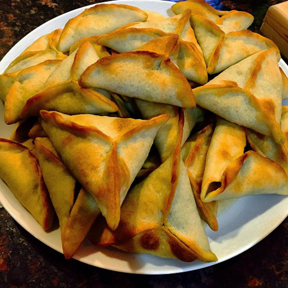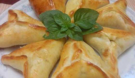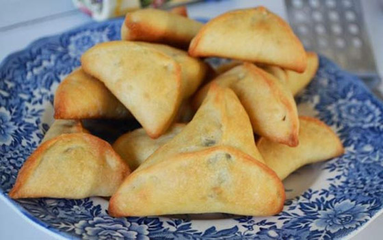 5. ضعي كمية من الحشو حوالي ملعقة كبيرة وأغلقي العجين على شكل مثلثات.