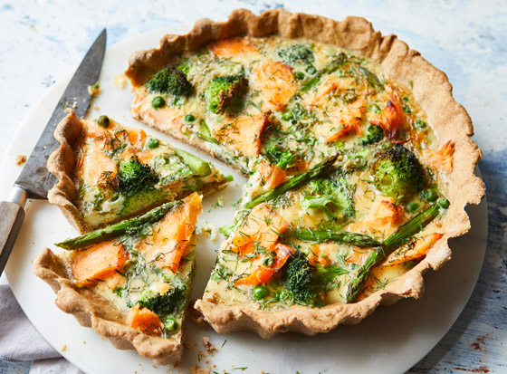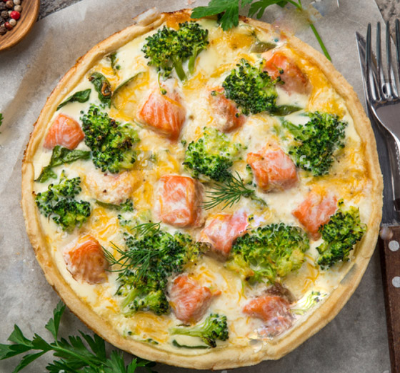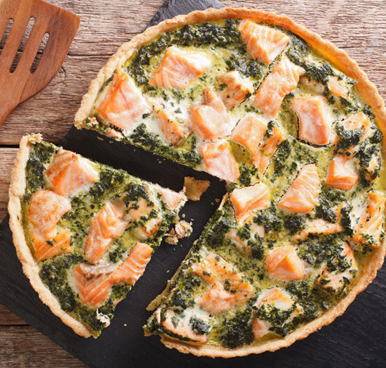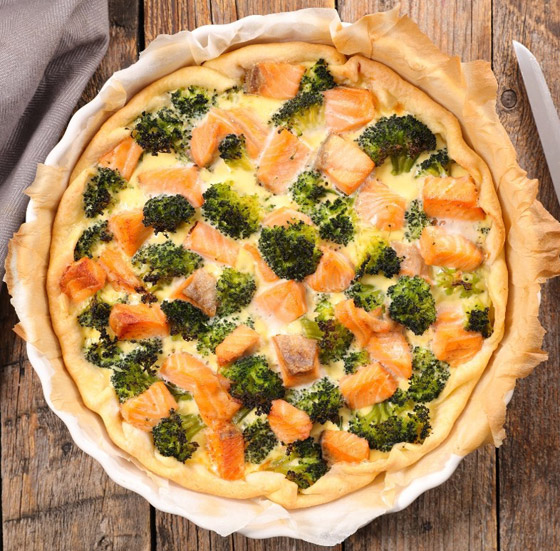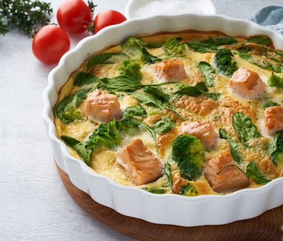 3. يوضع خليط البيض في صينية الخبز، ثم تصفّ قطع السلمون، بشكل جميل فوق خليط البيض، وتزين الصينية بالبروكلي وأوراق السبانخ، وتزج في فرن 180 درجة مئوية، حتى يجف البيض.