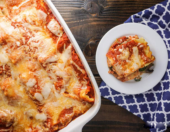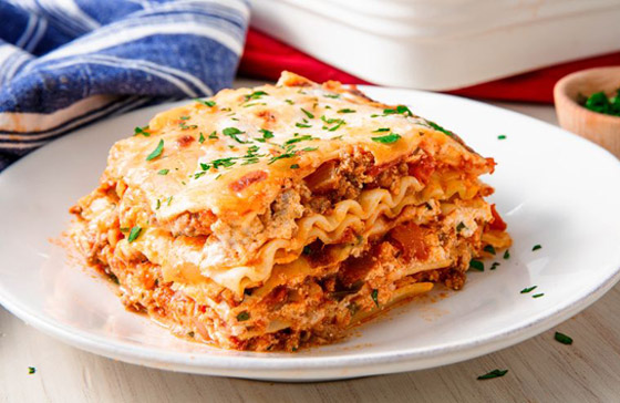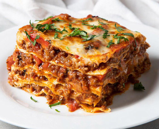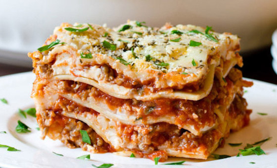 3- قطعوا ربع جبنة الموتزاريلا إلى شرائح رفيعة واتركوها جانباً، ثم ابشروا الباقي وامزجوه مع الريكوتا والبيض، ثم ضعوا ثُلثي كوب صلصة الطماطم المحفوظة في قاع طبق خبز، ثم غطوا بطبقة واحدة من اللازانيا وثلث مزيج الريكوتا وثلث صلصة اللحم، وكرروا العملية مع الطبقات المتبقية ثم غطوها بورق القصدير واخبزوها نحو 45 دقيقة حتى تنضج الصلصة ثم انزعوا ورق القصدير وضعوا فوقها شرائح الموتزاريلا واستمروا في الخبز لمدة 15 دقيقة أخرى حتى تذوب الجبنة، ثمّ اتركوها ترتاح لمدة 20 دقيقة ورشوا البقدونس المفروم قبل التقديم مع السلطة الخضراء وخبز الثوم.