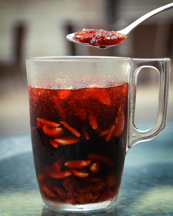 4. قدِّم مشروب الجلاب الناتج في أكواب صغيرة مع قطع الثلج.