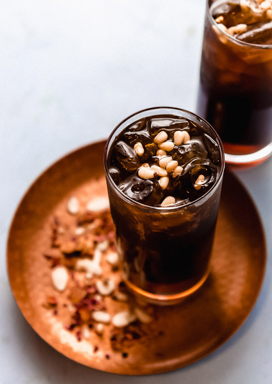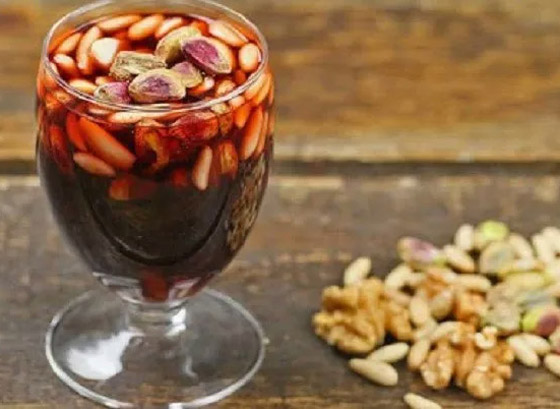 4. يترك الجلاب في البراد إلى حين التقديم ويُسكب في الأكواب ويقدم مع مكعبات الثلج أو الثلج المبروش ثم يزين بالصنوبر والزبيب.