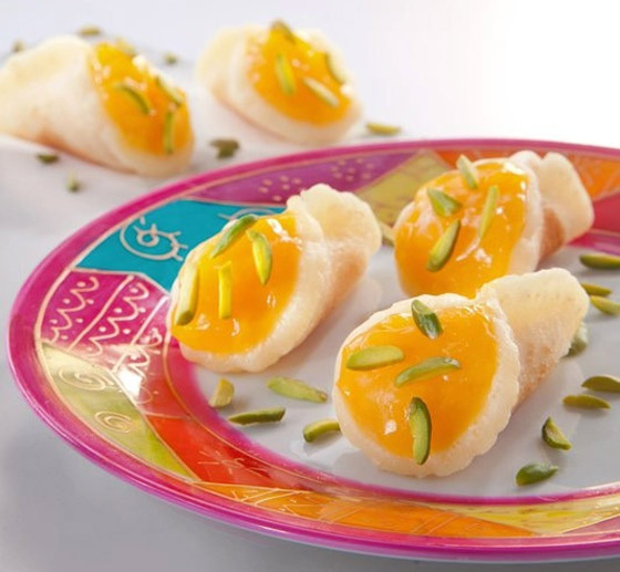 5. أمسكوا قرص القطايف واقفلوا طرفه، ليتكوّن لديك قمع صغير. املؤوا، باستعمال ملعقة صغيرة، القمع بمهلبيّة قمر الدين.