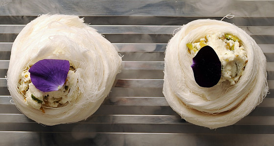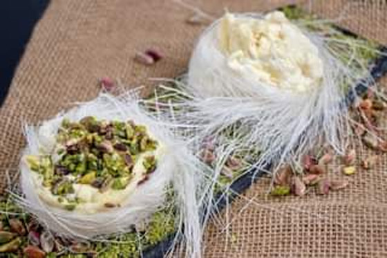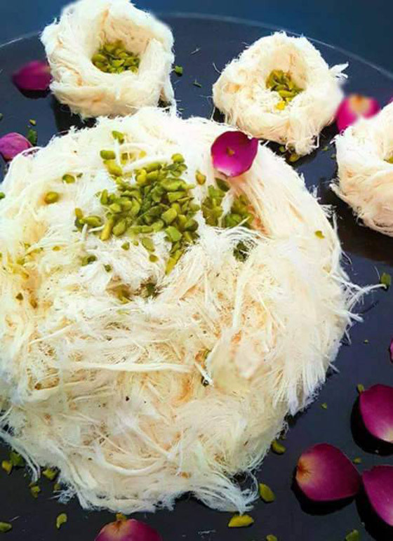 - في صحن التقديم، نفرد طبقة من القشطة العربية ونضع عليها طبقة من غزل البنات أو شعر البنات ثمّ نزيّن بالفستق الحلبي، بسكويت اللوتس، الورد المجفف الصالح للأكل ونغطّيه بالقشطة.