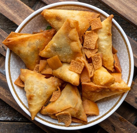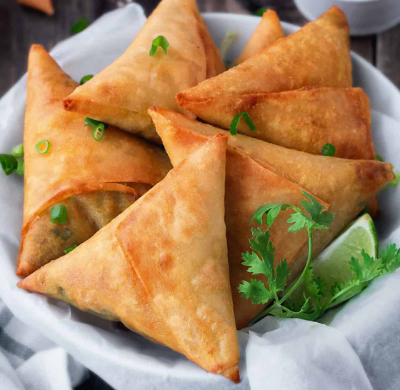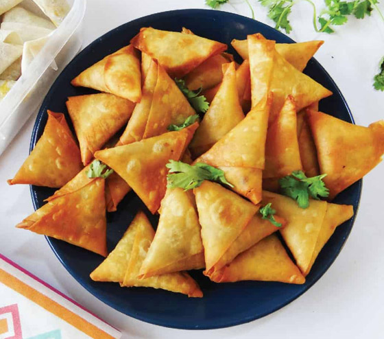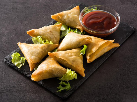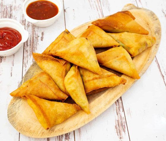 2. ضعوا القليل من الحشوة على طرف كل شريحة من عجينة السمبوسة، ثمّ لفوها على شكل مثلث وأغلقوها بإحكام عن طريق دهن الأطراف بالقليل من البيض المخفوق.