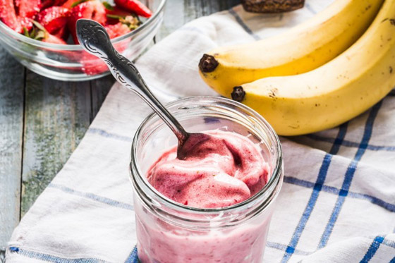 1. ضعوا كلاً من الموز والفراولة في كيس وضعوه في الفريزر إلى أن يتجمد.