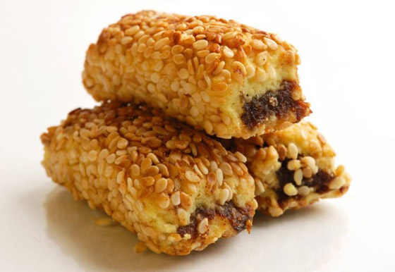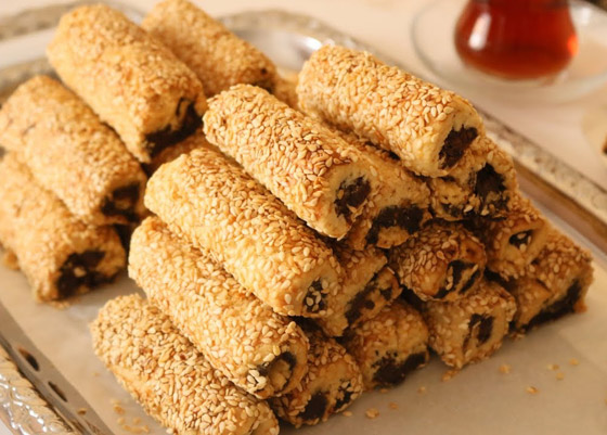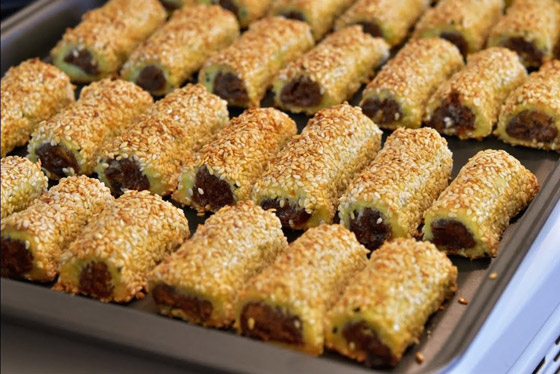 7. احشوا كل شريط عجينة بشريط من التمر ولفوها على شكل أسطواني وقطعوها إلى أجزاء ومن ثم اغمسوها بالسمسم.