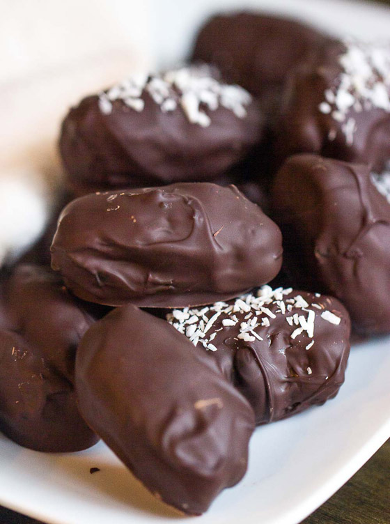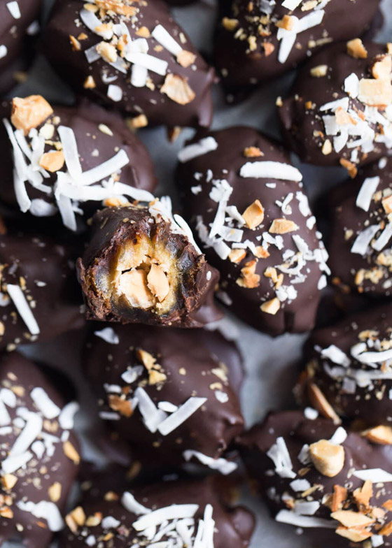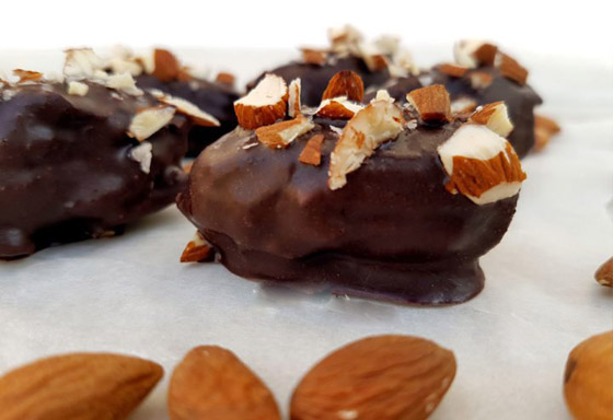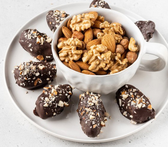 تمر محشو بالمكسرات ومغطى بالشوكولاتة الداكنة... أضيفوا نكهة مميزة وشهية لحبات التمر المتوفرة لديكم وجربوها بحشوة من المكسرات ومغطاة بطبقة من الشوكولاتة الداكنة اللذيذة، وصفة حلويات سهلة وسريعة وفاخرة على سفرة ضيافتكم. وقت الطهي: 30 دقيقة.. يكفي ل: 8 أشخاص.