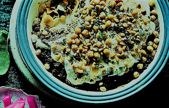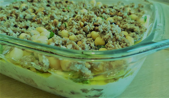 6. نحضر طبق التقديم ويرص به الخبز المحمص والحمص، ويصب عليه خليط الزبادي حتى يغطى تماما.