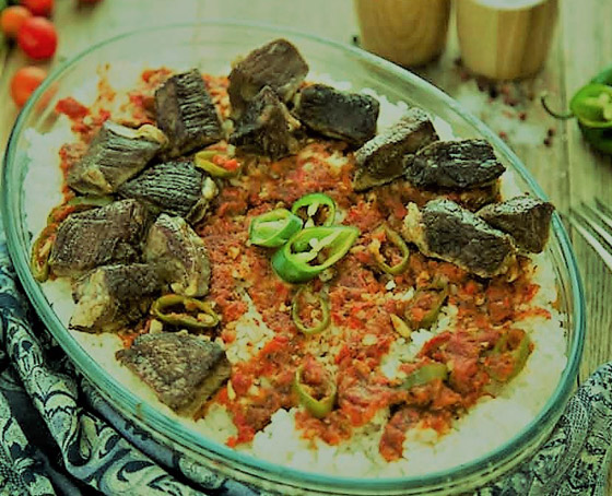 6. تضاف مرقة اللحم الساخنة للخبز والأرز ثم تضاف الصلصة وتوزع بالملعقة فوق الأرز والخبز ثم أخيراً تضاف قطع اللحم.