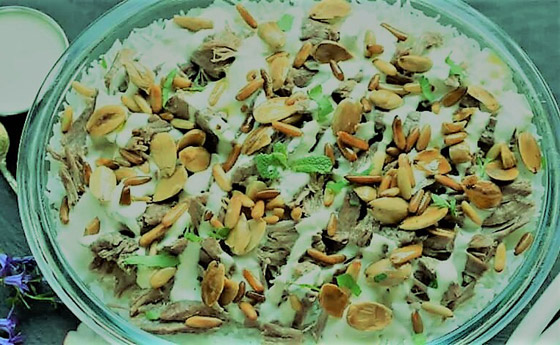 13. توضع فوق طبق الفتة ويرص عليها اللحم بعد تحميرها وبالهنا والشفا.