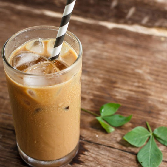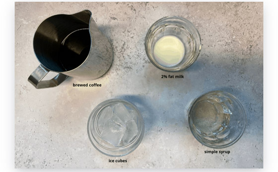 تُصنع القهوة المثلجة بالحليب باستخدام قهوة طازجة، و2٪ حليب دسم، وشراب حلو بسيط مثل الفانيليا أو الكراميل، وكمية جيدة من مكعبات الثلج لبداية يوم منعشة.
