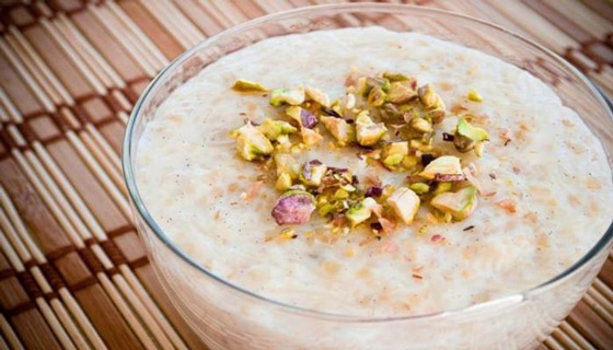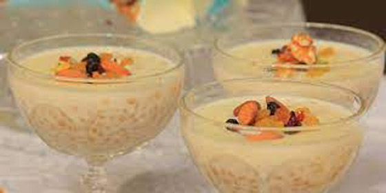 وضع قدر على النار به اللبن والقمح والسكر والفانيليا، وترك المكونات تغلي قليلاً.