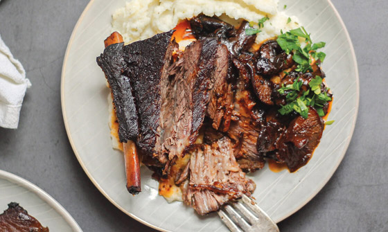 في صحن التقديم، نضع الأرز الأصفر أولاً، ثم نضيف أضلاع اللحم على الوجه، إلى جانب صوص الأفوكادو.