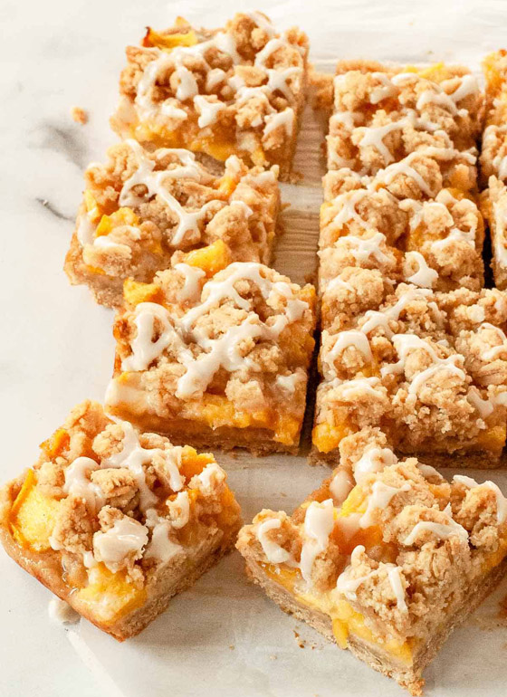 5. افردي شرائح الدراق في قالب كيك مبطن بورق زبدة ورشة من السكر الطبيعي، ثم اسكبي خليط الكيك في القالب.
