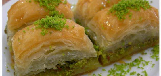 ترص في صحون التقديم وتزين بالفستق الحلبي المبروش.
