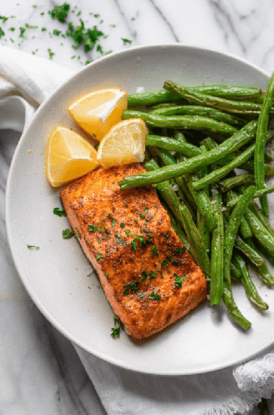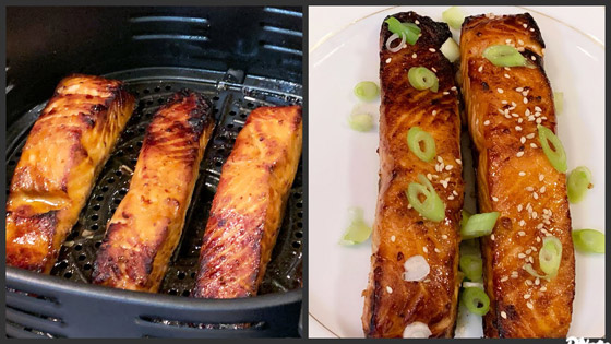 يمكن أن تؤدي درجة الحرارة المرتفعة للقلايات الهوائية إلى تجفيف اللحوم والأسماك بسرعة كبيرة، لذا لمنع طهي السمك بشكلٍ مفرط، قومي بتتبيل أربع شرائح من سمك السلمون مع نصف ملعقة صغيرة من الملح والفلفل، ثم قومي بقليها في الهواء عند 400 درجة فهرنهايت لحوالي 8 إلى 10 دقائق.
