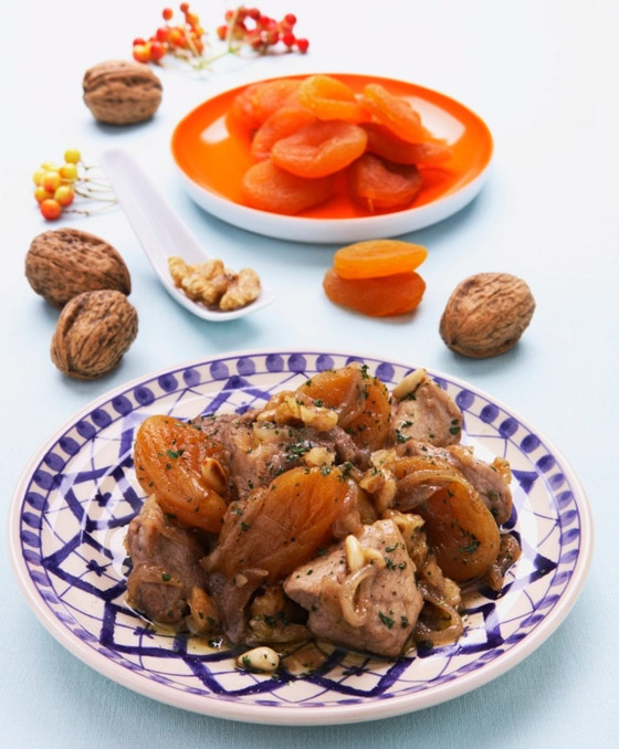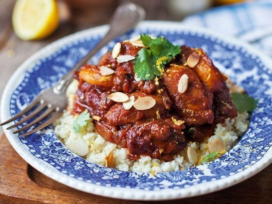 1. أوّل خطوة في تحضير طبق طاجين الحلو، أن نضع كمية من الماء الساخن في إناء، ثمّ نضع في داخله الفواكه المجففة ونتركها جانباً لمدة نصف ساعة، أو يمكن أيضاً تفويرها فوق الماء لمدة 20 دقيقة حسب الاختيار.