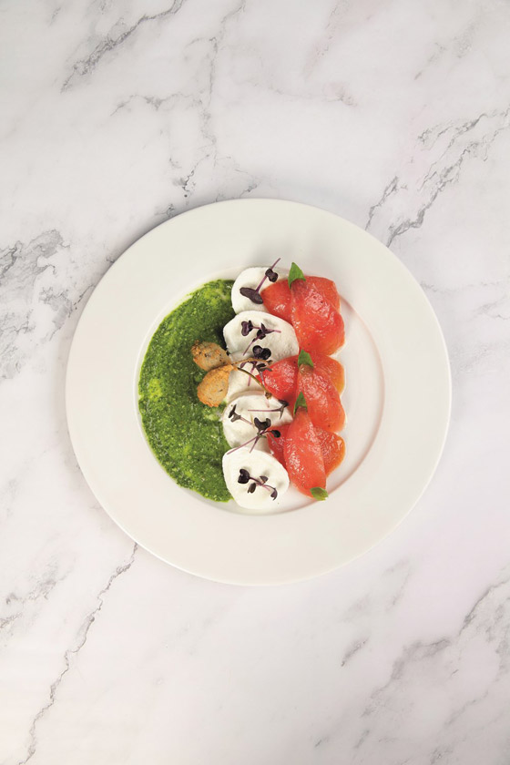 - تضاف، على جانب الصحن، صلصة البيستو الخضراء.