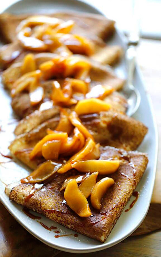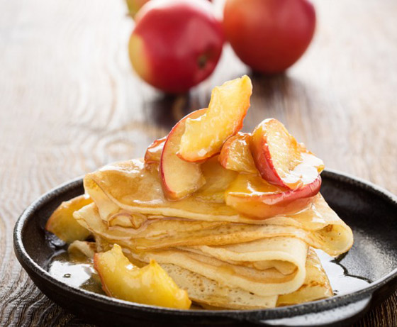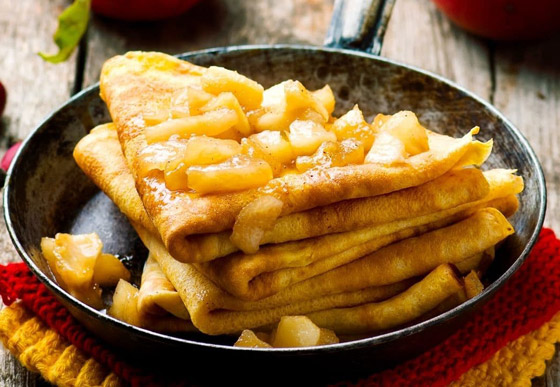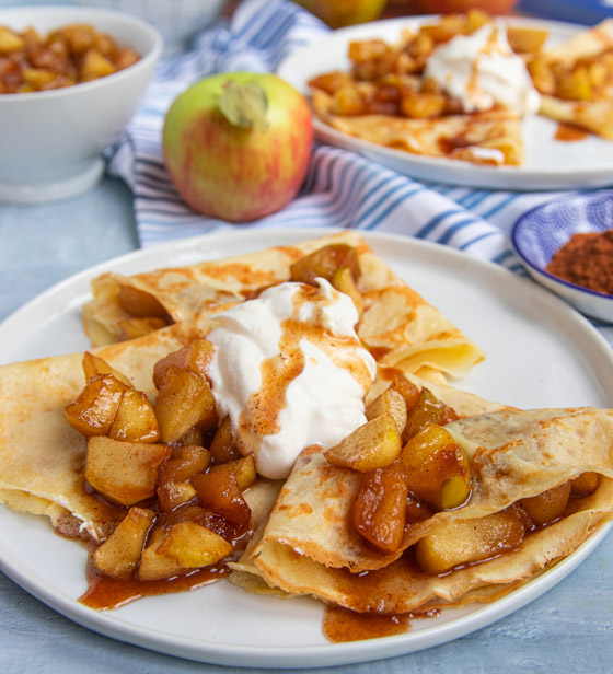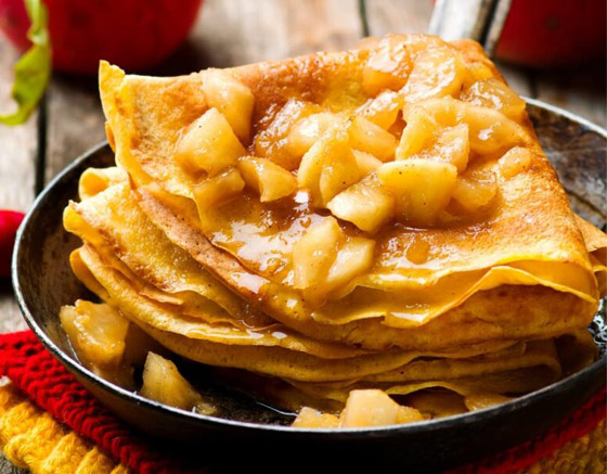 7. احشوا عجينة الكريب الجاهزة بالقليل من حشوة التفاح، ثم لفّوها على شكل رول وضعوها في طبق التقديم، وقدموها.