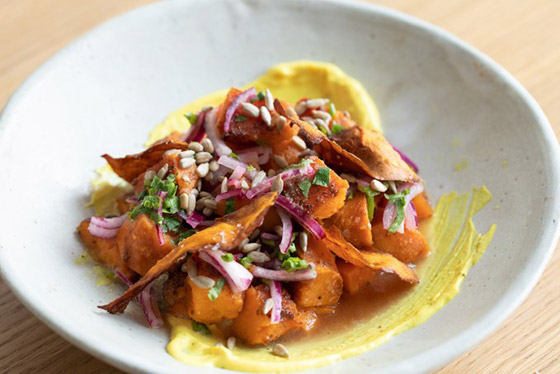 - يقدم الطبق مع شرائح البطاطا الحلوة المطبوخة وحبات الذرة.