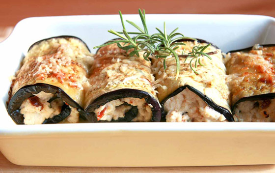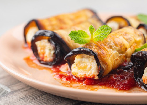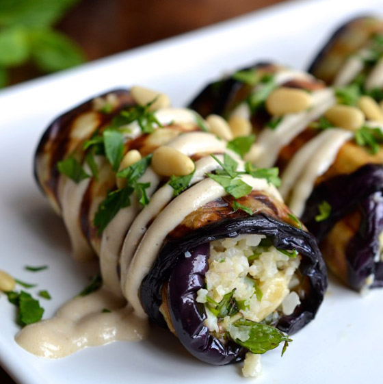 11. رشوا الجوز المطحون على لفائف الباذنجان بالجبن وقدموها ساخنة.