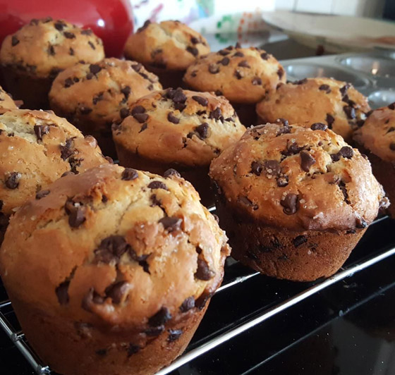 7. وزعوا المزيج في قوالب الكب كيك ووزعوا حبيبات الشوكولاتة على الوجه.