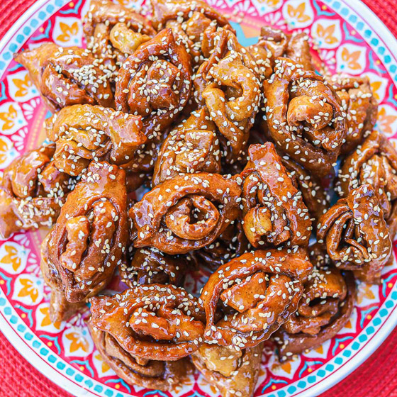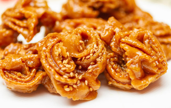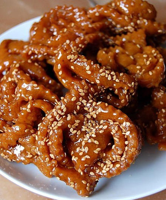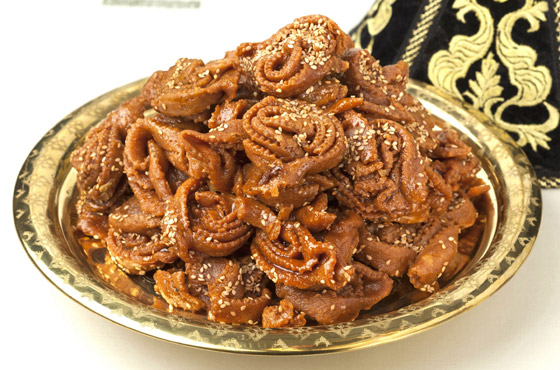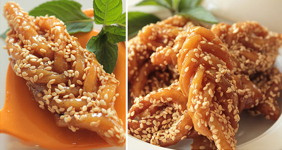 7- يتم قلي الشباكية في حمام زيت ساخن، وبعد أن تكتسب لوناً ذهبياً من الجانبين، يتم تصفيتها من زوائد الزيت، وغمسها في العسل، ثم تصفيتها من العسل الزائد، ورشها بالسمسم المحمص، لتكون جاهزة للتقديم.