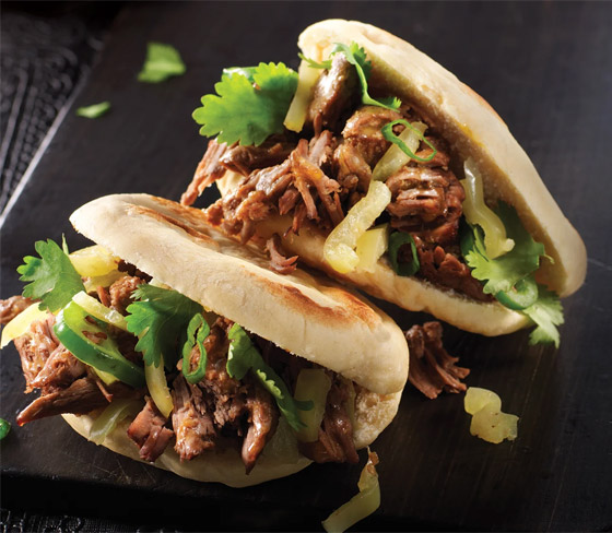إلا أنه في البداية كان يقدم اللحم في أطباق، حتى بداية القرن الأول، حيث تم تطوير الوجبة، لتوضع شرائح اللحم في الخبز المسطح المشهور في آسيا الوسطى، وذلك من طرف الجنرال الصيني بان تشاو، الذي أمضى أكثر من 30 عاماً في محاربة اتحاد من القبائل البدوية بغرض استعادة السيطرة على أقاصي الغرب الصيني.