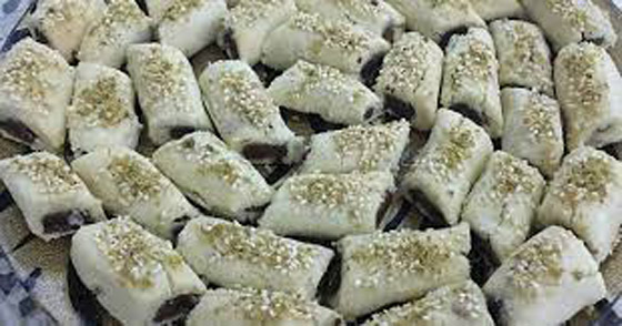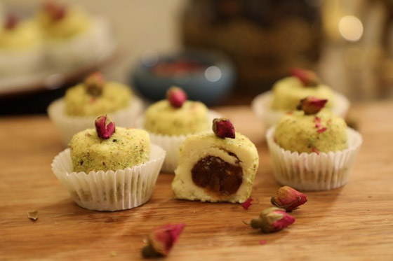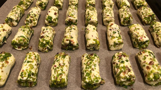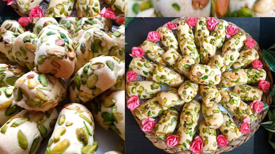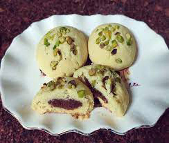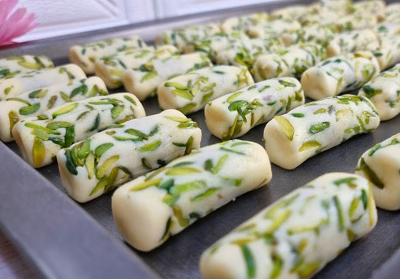 نأخذ قطعة من العجين ونحشيها بالتمر بعدها نشكلها كما نريد ثم نغطيها بالفستق الحلبي.