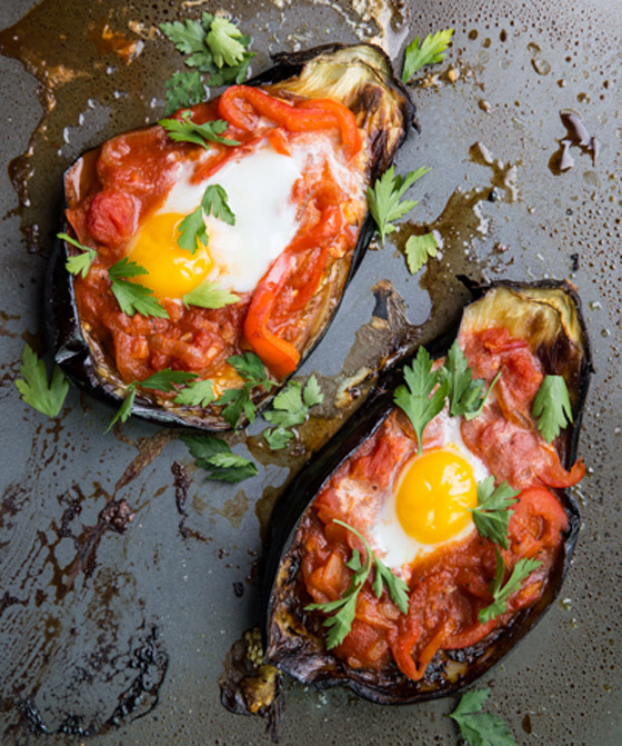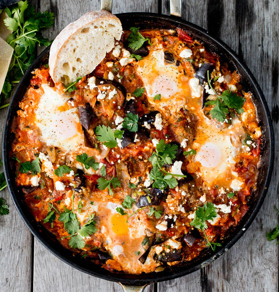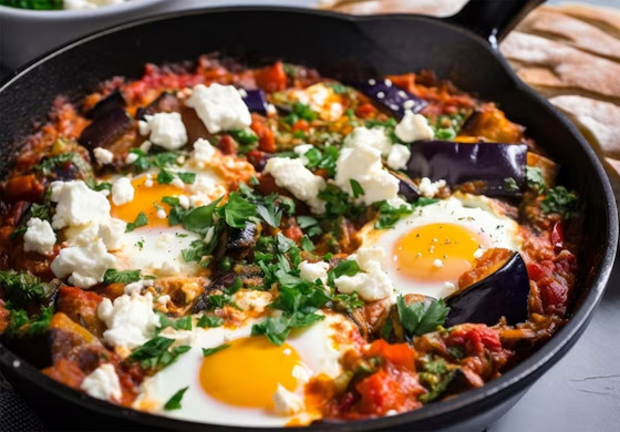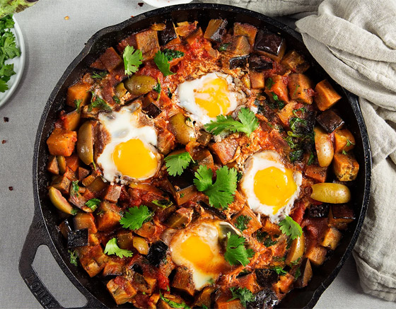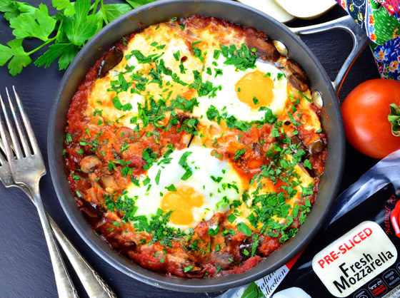 6. يضاف البيض برفق في مقلاة فوق الطماطم، ثم تنقل المقلاة إلى فرن مسخن مسبقاً وتخبز حتى ينضج البيض، لحوالي 10 دقائق.