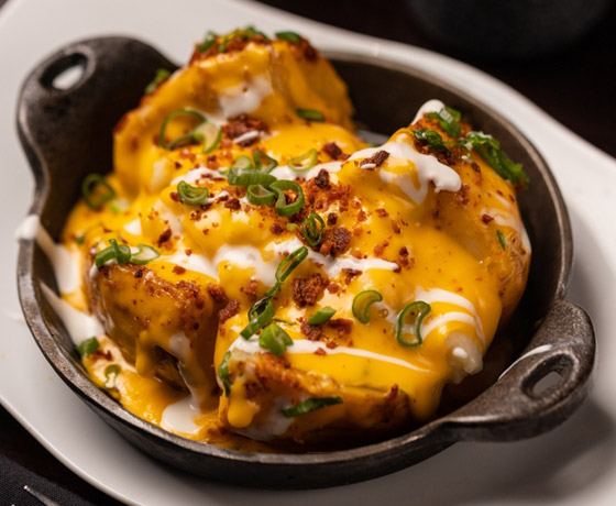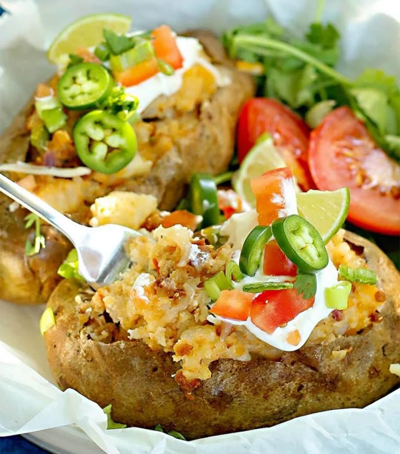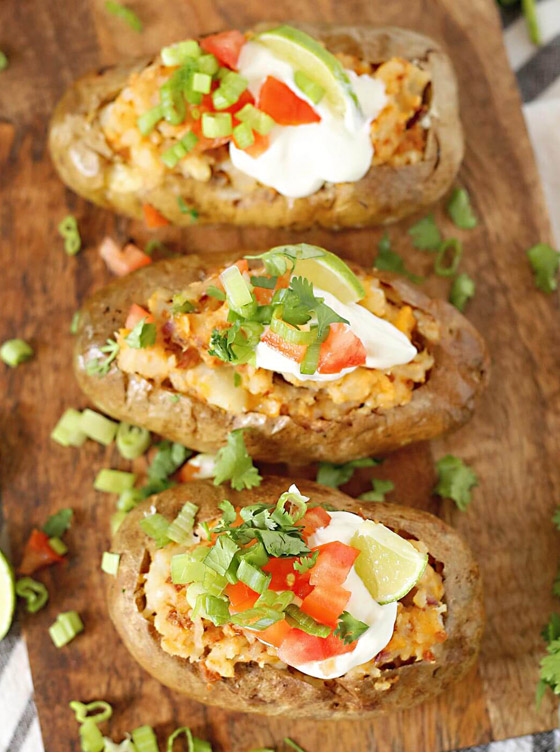 7. وزعوا جبن الشيدر المبشور، والفلفل الحار، والبصل الأخضر الشرائح، والفاصوليا الحمراء على سطح البطاطس، ثم ضعوها في الفرن لمدة دقيقتين أو حتى يذوب الجبن، وتقدم.